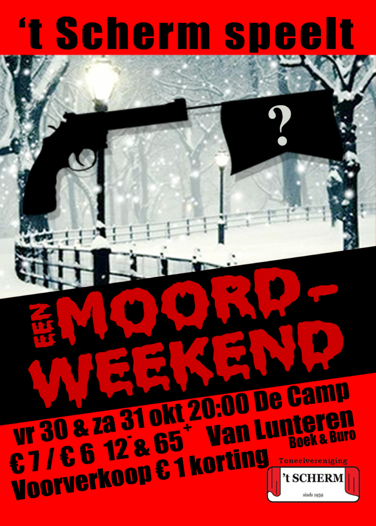 Op vrijdag 30 en zaterdag 31 oktober speelde toneelvereniging ’t Scherm twee vrolijke voorstellingen in De Camp in Woudenberg. Met een topbezetting van bijna alle leden werd het stuk “Een Móórd-weekend” van Jan Duijnhoven opgevoerd.